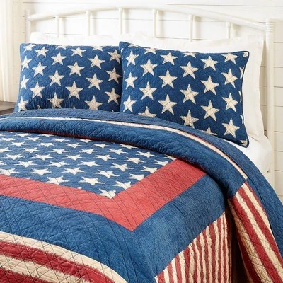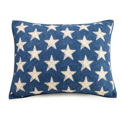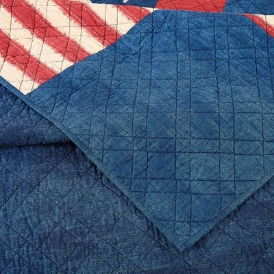 Adorn your bedroom with classic americana patchwork. Center star fabric is bordered by red and blue denim prints. Red and white stripe print and star print have faux stitching and fraying detail to add rustic flair. The reverse is a blue denim print. Quilting in a plaid design adds more pattern and texture. Matching shams in the star print complete this stately bed. All soft 100% cotton.