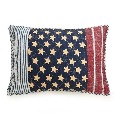 A festive parade of stripes with a sprinkling of stars in patchwork piecing make this quilt a true americana look. Deep navy, true blue, and red feature in these textured class prints. This easy cozy quilt is all 100% cotton. Irregular piecing adds to the comfortable vintage homemade feel. The quilt reverses to a print of blue stripes. A set of matching shams complete this charming bed.