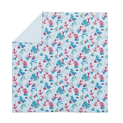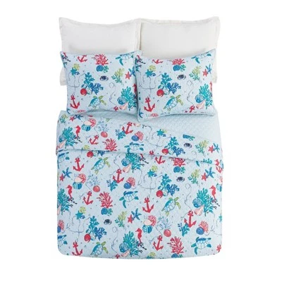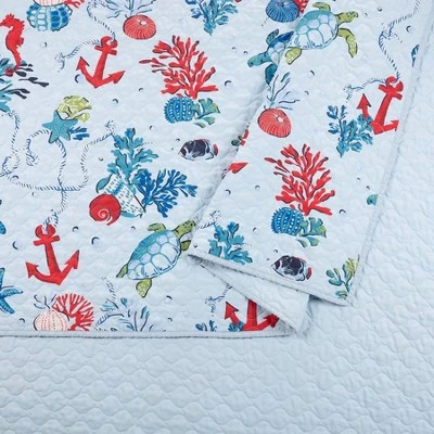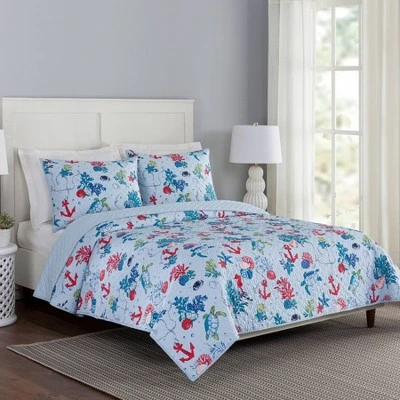 The heart of the Vera Bradley company is a desire to bring meaningful beauty to the world. Their bright brilliant designs are offered in bedding as well as their bags. Escape to the seashore with the Anchors Away quilt. A whimsical mix of sea life, shells, bubbles, and anchors come alive in this print. The bright palette of blues, greens, and red enrich a light blue ground. The wave quilting pattern adds to the coastal style. This cozy quilt is made of brushed poly fabric with cotton/poly fill.