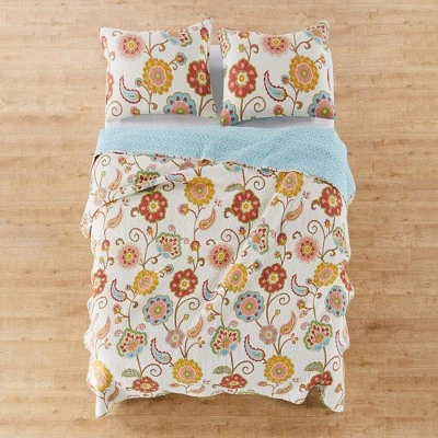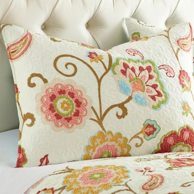 The Ashbury Spring Quilt Set by Levtex Home is inspired by traditional stitched floral quilts. This ivory, coral, gold and teal design will immediately transform your bedroom. Made with the softest lightweight cotton, this reversible quilt features flowers and paisleys in a sweet spring palette, reversing to a aqua geometric on the other. The Ashbury Spring Quilt Set is machine washable and includes the quilt and matching pillow shams. Enjoy this for years to come!