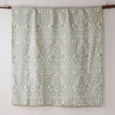 The Assisi Reversible Quilt Set by Levtex Home is inspired by antique European wallcoverings and tapestries. Offered in classic mint, blue, taupe and cream, this design will immediately transform your bedroom. This reversible quilt features a rich collection of beautiful regal floral on the front, reversing to a small clover outlines in taupe on cream on the back. The quilt and sham have a cotton front and cotton back, filled with a cotton-rich filler, and are machine washable. Enjoy this for years to come!