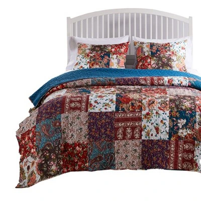 Capture the beauty of the season with classic colors and rich, updated florals. Digitally printed onto whole cloth in a patchwork appearance, with an imaginative awareness of time honored quilting traditions, the Poetry quilt set reverses to an all over solid color peacock blue. OverProduct Sized for better coverage on today’s deeper mattresses. Product Color: Classic. Product Size: Twin, Full/Queen and King.