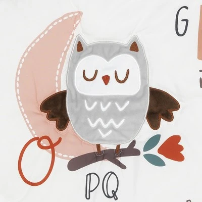 This three-piece nursery crib bedding set includes one quilt, one fitted crib sheet, and one crib skirt. It is made in a super soft microfiber material. The quilt features a loveable bear, friendly fox, wise owl, cute porcupine, huggable bunny, and happy turtle. Our wise owl stands proudly on a crescent moon in the center of the quilt. He is appliqued in a light gray velour; his face is white velour, and his wings are a dark brown velour. The complete alphabet is cleverly placed throughout the quilt providing a great learning opportunity with baby. The coordinating fitted crib sheet is a pretty shade of sage and has all of the cute characters, acorns, scattered plants, mushrooms, raindrops, and white clouds. There is elastic all the way around ensuring a safe and secure fit on a standard sized crib mattress measuring 28” X 52”. The crib skirt adds the finishing touch to your child’s crib. It has an adorable scene with all the characters playing and having fun. It has a 10” drop and all items are machine washable for easy care.