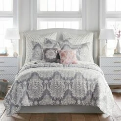 The Belhaven Reversible Quilt Set by Levtex Home is inspired by classic European wall coverings. This luscious damask design will immediately transform your bedroom. Made with the softest lightweight cotton, this reversible quilt features a large scale classic damask in cream on a grey ground, reversing to a ditsy damask in grey on cream on the other. The Quilt Set is machine washable and includes the quilt and matching standard pillow shams. Enjoy this for years to come!