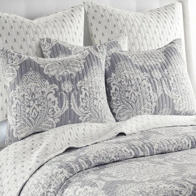 - THE BELHAVEN DESIGN: One of our most popular quilt sets, Belhaven is inspired by classic European wall coverings, with a large scale classic damask in cream on a grey ground and a charming reverse pattern of ditsy damask in grey on cream. A bound border provides contrast and texture to complete the look. The matching shams are randomly cut from the same fabric as the quilt, making each sham unique and not identical to any other sham.