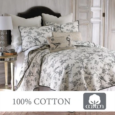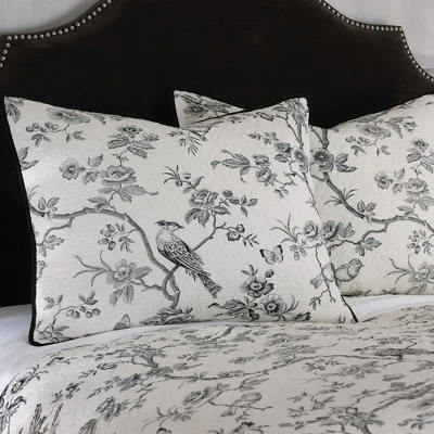 The Black Toile Reversible Quilt Set by Levtex Home is inspired by traditional french wall coverings. Offered in shades of black and cream, this design will immediately transform your bedroom. Made with the softest lightweight cotton, this reversible quilt features a delicate, detailed vine and bird toile. Enjoy this for years to come!