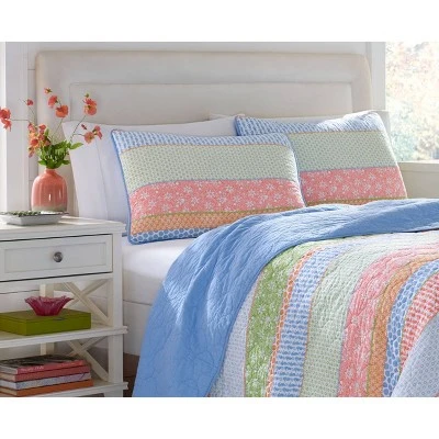 Indulge your bohemian side with this energized new take on classic patchwork quilts. Horizontal bands of mini print patterns in a fresh palette of pink, orange, lime, and chambray blue on white set a cheerful mood and the soft cotton fabric is pre-washed for added comfort. The quilt reverses to solid chambray blue which also trims the edges of the quilt and shams for a clean, tailored finish.