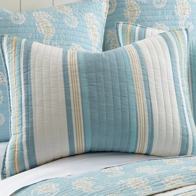Bring the seaside into your home with the Levtex Home Blue Maui Quilt Set. Stylish and fun, this set offers an attractive striped front in blue and taupe hues, and artfully reverses to a taupe sea horse print on a calming blue ground. 100% cotton, machine washable, this set includes a beautiful quilt and matching shams that are sure to make you long for the sea.