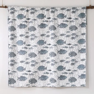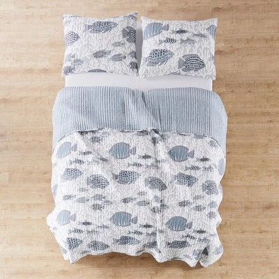 The Cambria Reversible Quilt Set by Levtex Home is inspired by a deep dive amount the corals of the Caribbean. This coastal design will immediately transform your bedroom. Made with the softest lightweight cotton, this reversible quilt features a school of fish as they swim among the coral, reversing to a navy, blue and cream stripe on the other. The quilt set is machine washable and includes the quilt and matching pillow shams. Enjoy this for years to come!