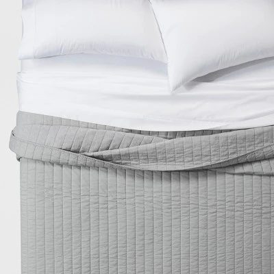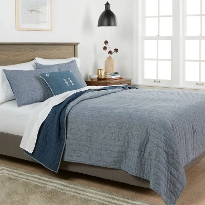 Add style and comfort to your bedding ensemble with this Chambray Linen Blend Quilt from Threshold™. Crafted from a cotton/linen-blend fabric, this chambray quilt wraps you in cozy comfort night after night, while the stripe-stitched quilted pattern gives your room an elegant touch. The simple design pairs perfectly with a variety of decor styles, so you can toss this cotton-filled quilt on your bed to create a perfect spot for relaxing and sleeping. Simply mix and match this cotton-blend quilt with your own sheets and pillows for a quick decor transformation you’re sure to love.