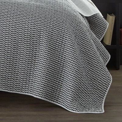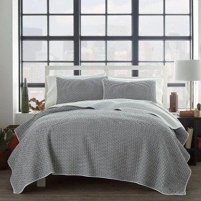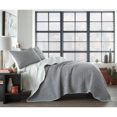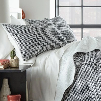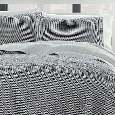 A small-scale geometric print creates an allover chevron texture in high contrast black and white. Looking closer, you will see the chevron rhythm of the design is created by rows of stylized leaves that soften the geometry and lend an organic note to this modern graphic. Pre-washed for extra softness, this all cotton quilt set is a cozy, lightweight bedding alternative that will get softer and more comfortable each time you wash it. The quilt reverses to solid white cotton that also trims the edges of the quilt and shams for a clean, tailored finish. A channel quilt stitch enhances the print, adding dimensional interest and additional comfort. Twin Quilt Set includes: One twin quilt (88″L x 68″W) and one standard sham (21″L x 27″W), Full/Queen Quilt Set includes: One full/queen (90″L x 90″W) and two standard shams (21″L x 27″W), King Quilt Set includes: One king quilt (96″L x 104″W) and two king shams (21″L x 37″W)