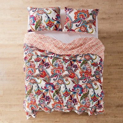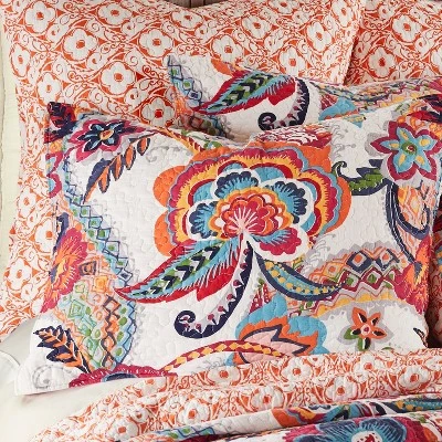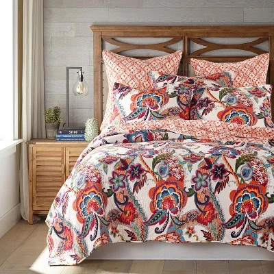 The Cleo Reversible Quilt Set by Levtex Home is inspired by a mix of traditional Jacobeans and bohemian print and pattern. Offered in shades of orange, teal, red and grey, this design will immediately transform your bedroom. Made with the softest lightweight cotton, this reversible quilt features a bright, bohemian floral on the one side, reversing to a orange floral on the other. The Quilt Set has a cotton rich filler (90% cotton, 7% rayon, 3% other fibers) and is machine washable. Enjoy this for years to come!