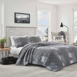 Wide horizontal bands of signature plaids and novelty winter-themed prints mix together in a cool and inviting palette of blue tones with carbon gray accents. The soft, pre-washed cotton quilt reverses to a deep tone blue and gray plaid that also trims the edges of the quilt and standard shams. Channel quilted for added warmth and comfort, this quilt set has both style and practicality. Twin quilt set includes: one twin quilt (88″l x 68″w) and one standard sham (21″l x 27″w), full/queen quilt set includes: one full/queen (90″l x 90″w) and two standard shams (21″l x 27″w), king quilt set includes: one king quilt (96″l x 104″w) and two king shams (21″l x 37″w)