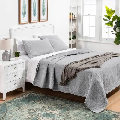 - Embroidered chambray quilt adds texture to your space