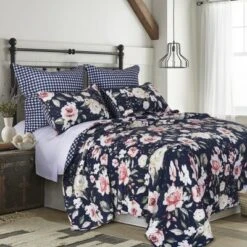 The Fillipa Reversible Twin Quilt by Thatch Home for Levtex Home is inspired by Renaissance floral paintings. Offered in navy and pink, this design will immediately transform your bedroom. This reversible quilt features large scale floral in shades of pink and cream on a dramatic navy ground on the front, reversing to a navy and white buffalo check on the back. The Twin Quilt (68x86in.) has a cotton front, a microfiber back and is filled with a cotton rich filler – all machine washable. Enjoy this for years to come!