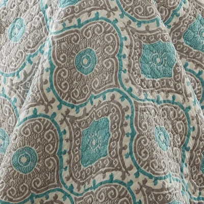 The Gramercy Reversible Quilt Set by Levtex Home is inspired by classic woven medallions. Offered in shades of grey, teal and ivory, this design will immediately transform your bedroom. Made with the softest lightweight cotton, this reversible quilt features a beautiful pattern of interlocking medallions on the one side, reversing to a teal on white trellis on the other. The Quilt Set has a cotton rich filler and is machine washable. Enjoy this for years to come!