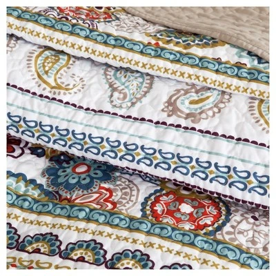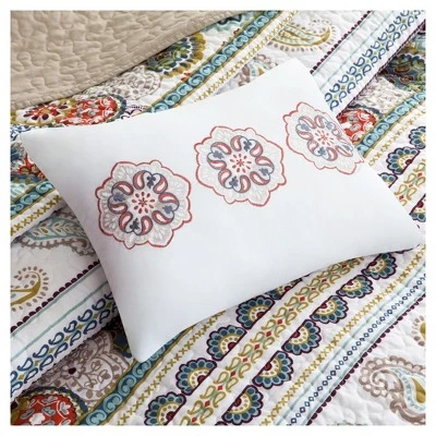 Dana Reversible Coverlet Set mixes colorful paisleys and medallions into a unique stripe design for a global look in your space. Completely reversible, the neutral taupe reverse allows you to mix this in with your current décor. Two decorative pillows use embroidery and fabric manipulation techniques to complete this look.