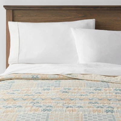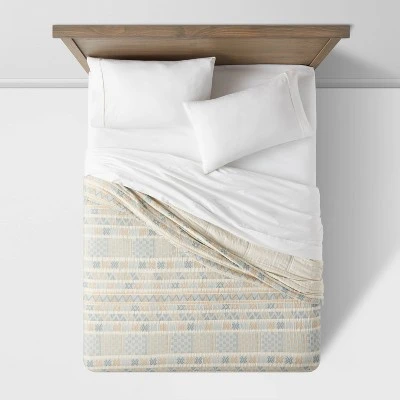 Attractive and comfortable, the Jacquard Gauze Quilt from Threshold™ makes the perfect addition to your bedroom. This off-white quilt is adorned with a geometrical jacquard pattern in light-blue and yellow shades on a gauze background to lend a soft and cozy touch of texture to the top of your bed. The midweight quilt is made of a soft cotton-bend fabric and backing for comfortable year-round use, and is machine washable for easy care. Pair with matching shams and a white sheet to complete your bedding ensemble.
