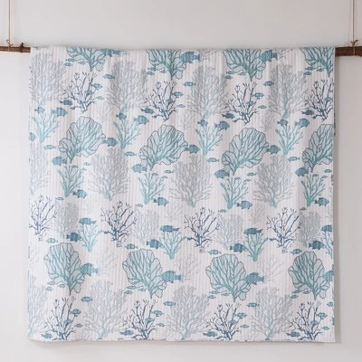 The Lacey Sea Reversible Quilt Set by Levtex Home is inspired by a snorkeling trip on a gorgeous coral reef. This intricate coral design will immediately transform your bedroom. Made with the softest lightweight cotton, this reversible quilt features a fish and coral in shades of blue on an off white ground, reversing to a blue and white stripe on the other. Enjoy this for years to come!