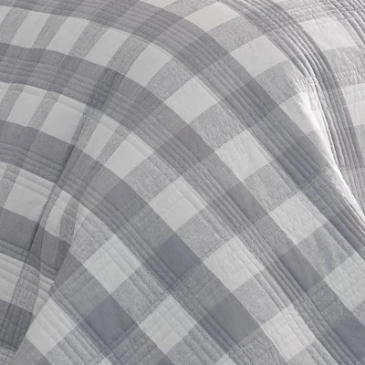Update your bedding ensemble with the Lakehouse Plaid cotton gray quilt set from Eddie bauer. Featuring an updated take on a classic plaid pattern, this gray and white quilt set brings rugged charm to your sleeping oasis. The all-cotton quilt is accented with double needle stitch edging and reverses to a solid gray ground. Keep it simple with solid white sheets or pair with our labrador fields cotton sheet set for a more fun accent. Quilt set is prewashed for added softness and is machine washable for easy care. Twin quilt set includes: one quilt (88″L x 68″W) and one sham (21″L x 27″W). Full/Queen quilt set includes: one quilt (90″L x 90″w) and two shams (21″L x 27″W). King quilt set includes: one quilt (96″L x 104″W) and two shams (21″L x 37″W).