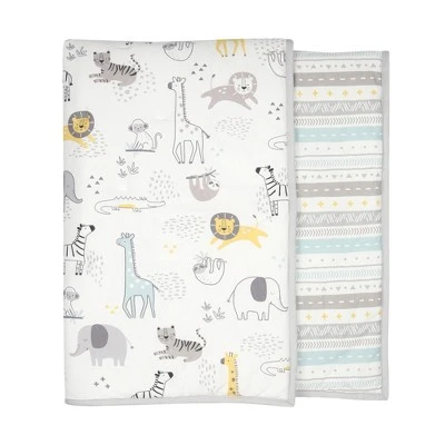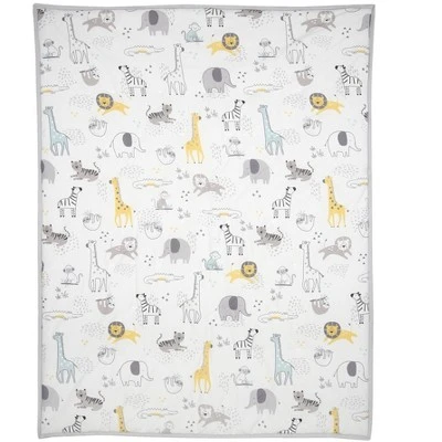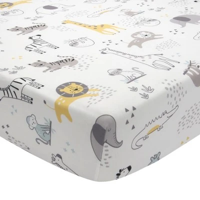 The four-piece nursery baby bedding set includes one quilt, one 100% cotton jersey fitted crib sheet, one crib skirt and a complete set of wall decals. This neutral color palette of jungle animals in shades of gray, taupe, yellow and turquoise is perfect for baby boys and baby girls. Our favorite jungle animals are featured including giraffes, elephants, tigers, zebras, lions, monkeys and sloths on a soft white ground. The back of the quilt is a colorful modern horizontal pattern with dots, triangles, and chevrons. The animal print breathable 100% cotton jersey fitted crib sheet is extra soft for baby’s comfort. It has elastic all the way around ensuring a safe and secure fit. The crib skirt gives the finishing touch to your child’s crib. It is a cotton blend in a light gray twill fabric with a white and gray printed twill tape feature and has a 14 ½” drop. There are two pleats on the front panel. Complete this jungle inspired nursery collection with a complete set of custom wall decals. They include a gray sloth, monkey, tiger and nine triangular pieces. They look like a custom mural and add a designer touch to a featured wall in the baby’s room. This is a popular baby shower and baby gift registry crib set.