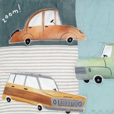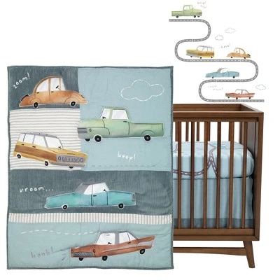 - 4-piece classic car crib bedding set includes one quilt, one 100% cotton fitted crib sheet, one crib skirt, and a complete set of wall decals