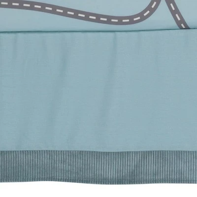 This 4-piece automobile themed nursery crib bedding set includes one quilt (36” X 45”), one breathable 100% cotton fitted crib sheet (28” X 52”), one crib skirt (51” X 27”), and one complete set of wall decals (approximate size as shown 45.5” X 47.5”). The quilt is a horizontal patchwork with cool classic cars designed with a watercolor technique. The words Beep Beep, and vroom along with curvy roads, vintage cars, and trucks decorate the breathable 100% cotton fitted crib sheet and wall decals. The crib skirt is made in a linen viscose with a 3” textured blue corduroy border. Have fun putting the vintage cars on the curvy road wall decals which create the look of a mural without any of the mess and no damage to your walls. This unique transportation themed baby bedding will surely put a smile on the face of your little driver.