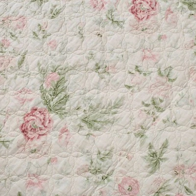 Update your bedding ensemble with the Breezy Floral cotton quilt set from Laura Ashley. This romantic garden floral creates a vintage mood in a soft palette of rose pink and dove gray with pale yellow accents on a creamy white background. The polka dot reverse print adds an additional feminine touch in pale pink and white, and also accents the edges of the quilt. This all-cotton quilt set is prewashed for extra softness and comfort. Layer this quilt set with a new Laura Ashley cotton sheet set for a more complete bedroom look. Set is machine washable for easy care. Twin quilt set includes: one quilt (88″l x 68″w) and one standard sham (21″l x 27″w). Full/queen quilt set includes: one quilt (90″l x 90″w) and two standard shams (21″l x 27″w). King quilt set includes: one quilt (96″l x 104″w) and two king shams (21″l x 37″w).