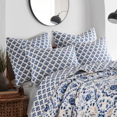The Lorrance Reversible Quilt Set by Levtex Home is inspired by beautiful floral gardens. Offered in blue, navy, taupe and white, this design will immediately transform your bedroom. This reversible quilt features a rich collection of medallions and flowers on the front, reversing to a small leaf pattern in navy on white on the back. The Quilt and Pillow Shamshave a cotton front and cotton back, filled with a cotton-rich filler, and are machine washable. Enjoy this for years to come!