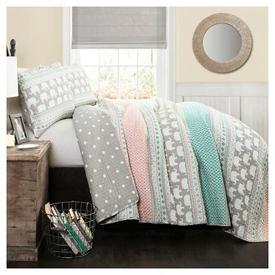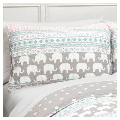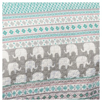 Give your gal’s bedroom a classic makeover with the Elephant Stripe Quilt Bedding Set. The mixed elephant and striped patterns are soft and fun and will give her room a charming look and feel. Elephants symbolize strength, honor, and stability- all great qualities to bring into your little girl’s bedroom. The quilted stitching adds a classic appeal. For your convenience, this easy care and cleaning curtain is machine wash and dry. Please refer to the product label for full care instructions.