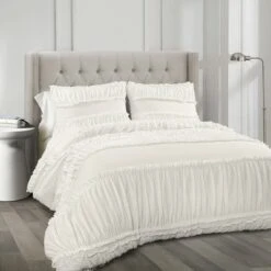 You will sleep like a baby when you add this amazingly soft Nova Ruffle 3 Piece Comforter Set to your bed. Beautiful ruffles and ruching detail give it an incredible textured look. This Nova Ruffle 3 Piece Comforter Set is ideal for a master or guest bedroom in just about any home decor theme. Whether you love shabby chic, traditional, modern or cottage style home decor, this set can fit right in with any of those. The stripes of ruffles on the comforter and the pillow shams create a whole new dimension to the bedroom. The texture of the Nova Ruffle 3 Piece Comforter Set has a calming effect, adding a touch of elegance with its ruching and ruffles. The Nova Ruffle 3 Piece Comforter Set includes a soft and luxurious 230 GSM comforter and two matching pillow shams. It is available in both King and Full/Queen sizes in off white. Due to the delicate nature of the frilly ruffles, this Nova Ruffle 3 Piece Comforter Set is labeled as dry clean only. Part of the Nova Ruffle Collection. Oeko-Tex Certified.