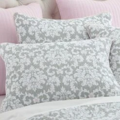 - THE MARGAUX DESIGN: One of our most popular quilt sets, Margaux is inspired by French design. The front features an intricate floral medallion design in grey with blush pink borders and accents and reverses to the same pattern. A bound border provides contrast and texture to complete the look.