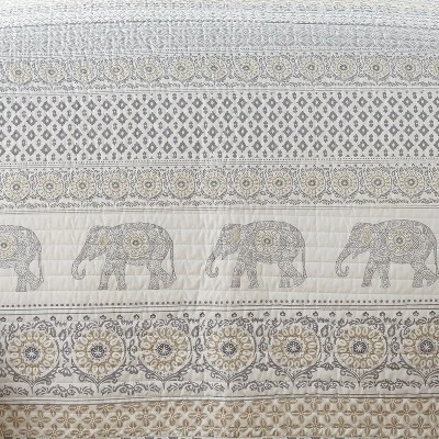 The Nacala Reversible Quilt Set by Levtex Home is inspired by a rustic elephant safari. Offered in shades of grey, taupe and white, this design will immediately transform your bedroom. Made with the softest lightweight cotton, this reversible quilt features a mosaic of muted tones and a charming parade of elephants on the one side, reversing to a grey and white diamond tile on the other. The Quilt Set is machine washable and includes the quilt and matching pillow shams. Enjoy this for years to come!