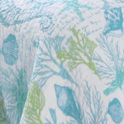 The Ocean Springs Reversible Quilt Set by Levtex Home is inspired by a snorkeling trip on a gorgeous coral reef. This intricate coastal design will immediately transform your bedroom. Made with the softest lightweight cotton, this reversible quilt features seahorses, shells and coral in shades of green and teal on a white ground, reversing to a teal and white geometric pattern on the other. The set is machine washable and includes the quilt and matching pillow shams. Enjoy this for years to come!