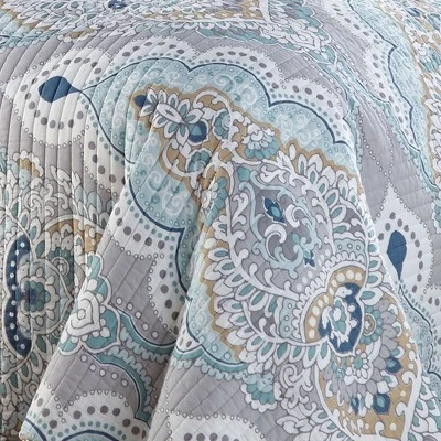 The Olyria Reversible Quilt Set by Levtex Home is inspired by the muted hues of soft Summer skies. Offered in shades of grey, taupe, teal and white, this design will immediately transform your bedroom. Made with the softest lightweight cotton, this reversible quilt features a classic and highly patterned medallion design on the one side, reversing to a ornate mini medallions on the other. The Quilt Set is machine washable and includes the quilt and matching pillow shams. Enjoy this for years to come!