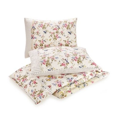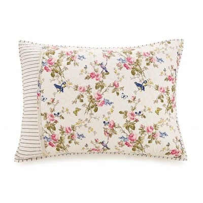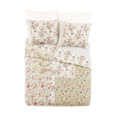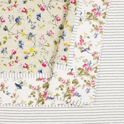 Add the enchanting ambiance of spring to your bedroom with the Phillipa Quilt from Jessica Simpson. Vintage inspired floral prints of rosy pink, blue, and sunny yellow grace a white ground. Among the flowers, bluebirds perch and butterflies flutter. The reverse is a denim blue ticking stripe that is also pieced into the face.