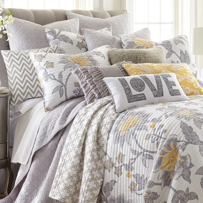 - LEVTEX REVERIE QUILT BED SET: A sophisticated grey, white, and yellow floral bedding set consisting of a Twin size quilt (68x86in.) and one matching pillow sham (26x20in.). Used by itself, as a layering piece or as a bedspread, this bedding set is extremely versatile.