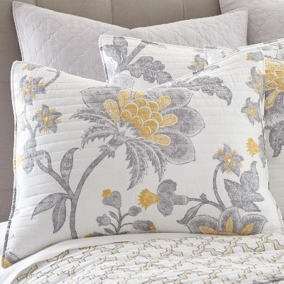 - THE REVERIE DESIGN: One of our most popular quilt sets, Reverie is inspired by a garden after a spring shower, with a grey, yellow, and white floral and a charming reverse pattern of yellow, grey, and white geometric pattern. A bound border provides contrast and texture to complete the look. The matching shams are randomly cut from the same fabric as the quilt, making each sham unique and not identical to any other sham.