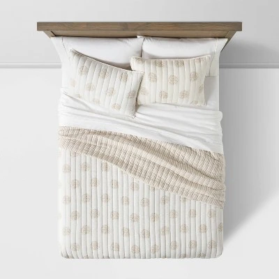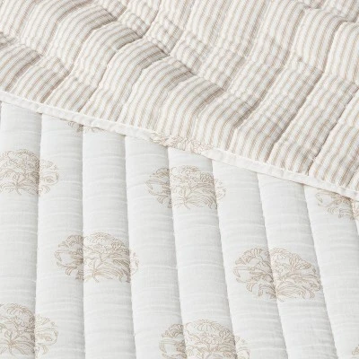 Add beautiful style to your sleep space with this Reversible Printed Voile Block Print Quilt from Threshold™. This beige and cream voile quilt printed with a floral block pattern brings dressy appeal to your bedding. It features a stitched quilted finish to lend a soft and cozy touch of texture to the top of your bed, along with a striped design on the reverse for a timeless look. This lightweight cotton quilt is complete with breathable cotton backing for comfortable year-round use, and is machine washable for easy care. Pair with matching shams and a sheet to coordinate your bedding ensemble.