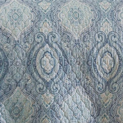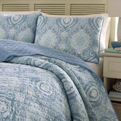 Our Tommy Bahama Turtle Cove quilt in aqua is inspired by a tropical vacation. The Tommy Bahama Turtle Cove quilt in aqua features a aqua and blue patterned design printed on an aqua ground with a solid aqua reverse. This quilt is 100% cotton, with a cotton (80%)/polyester (20%) filling, lightweight and easy to layer. The shams feature a two piece back closure. The corners of the quilt are rounded to match the sham, both edges are finished with a fabric binding. This quilt set is fully reversible. We have reduced our packaging, eliminating all plastic. Your quilt set will arrive secured with a ribbon. The set includes 1 quilt and 2 shams (1 sham for the twin set). Machine washable, for easy care.