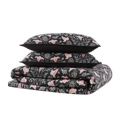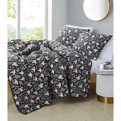 A black base helps to highlight the ornate floral vine with blush pink trumpet flowers positioned in a heart shaped pattern. The reverse is a solid color black coordinating to the face print. Face cloth is 100% cotton and the reverse is a soft 100% microfiber polyester. Each set contains coordinating pillow shams where twin has one sham and larger sizes include two shams. Face is 100% cotton, reversing to 100% microfiber. Filled with 50% cotton/50% polyester. This item is machine washable, but please be sure to use appropriate sized machinery to avoid any excess wear on the items. Includes: one twin/twin XL quilt 68×90 inches and one standard sham 20×26 inches.