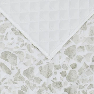This nature inspired print uses patterns from howlite jasper stone with a smooth white base in a marble-like pattern with dark charcoal veins running through it. The reverse is a solid white coordinating to the face print. Face cloth is 100% cotton and the reverse is a soft 100% microfiber polyester. Each set contains coordinating pillow shams where twin has one sham and larger sizes include two shams. Face is 100% cotton, reversing to 100% microfiber. Filled with 50% cotton/50% polyester. This item is machine washable, but please be sure to use appropriate sized machinery to avoid any excess wear on the items. Includes: one twin/twin XL quilt 68×90 inches and one standard sham 20×26 inches.