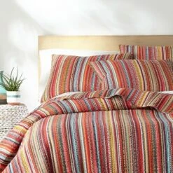 - LEVTEX ULURU QUILT BED SET: A striped, bright, bohemian bedding set consisting of a Twin size quilt (68x86in.) and one matching pillow sham (26x20in.). Used by itself, as a layering piece or as a bedspread, this bedding set is extremely versatile.