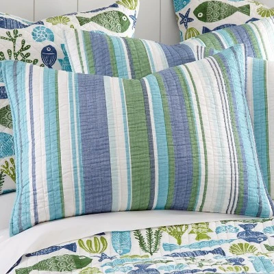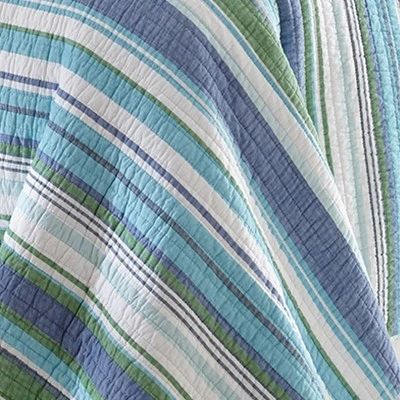 The Vero Reversible Quilt Set by Levtex Home is inspired by the colors of the ocean. Offered in shades of teal, blue, green and cream, this design will immediately transform your bedroom. Made with the softest lightweight cotton, this reversible quilt features a printed stripe in blues and greens on the one side, reversing to a modern Swedish-inspired fish print on the other. The Quilt Set has a cotton rich filler (90% cotton, 7% rayon, 3% other fibers) and is machine washable. Enjoy this for years to come!
