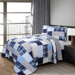 The Winter Plains Quilt Mini Set features plaid pieced stripes in shades of brown and tan and reverses to a solid color. Made from 100% cotton, this quilt is soft to the touch and can be used year round. The set includes 1 quilt and 2 shams. Machine washable for easy care. The Winter Plains Quilted Throw is matching for decorative, sold separated.